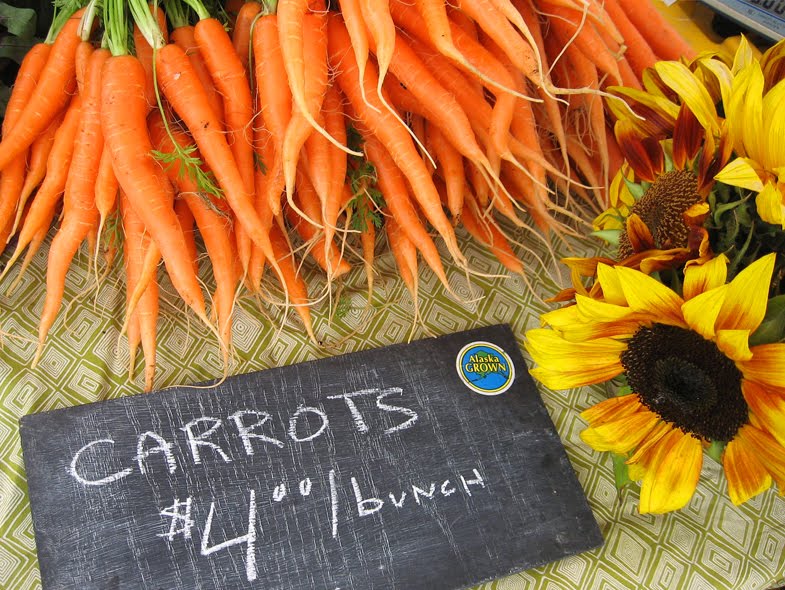 Some of the season's first carrots and lovely sunflowers from Spring Creek Farms.